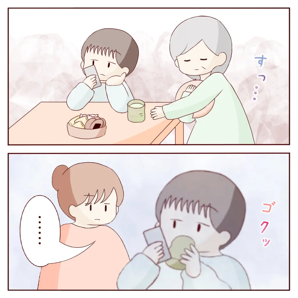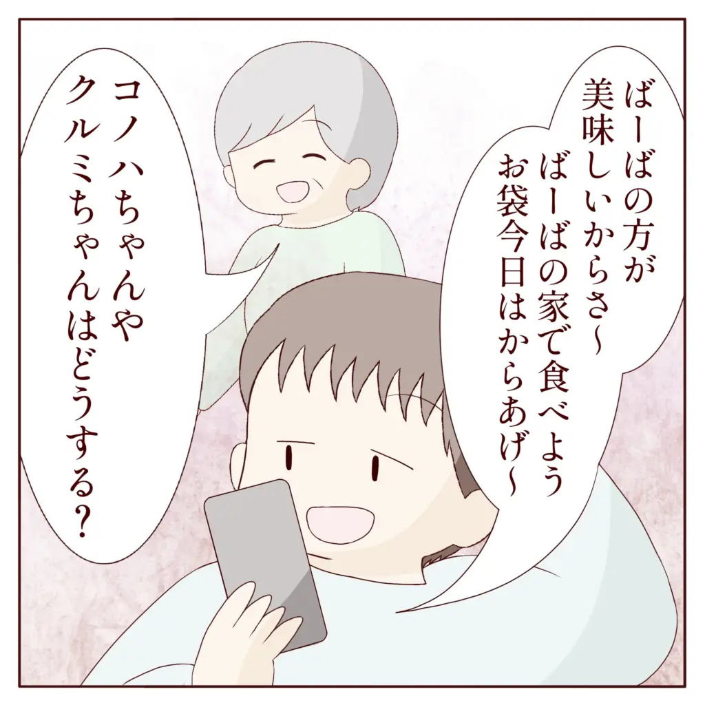 それを聞いていたマサヒコは、「ばーばの方が美味しいからさ~。ばーばの家で食べよう」そう言うと、「お袋今日はからあげ~」と、まるで偉そうな上司のような口ぶり。義母はそれには何も答えず「コノハちゃんやクルミちゃんはどうする?」と子ども達にたずねました。