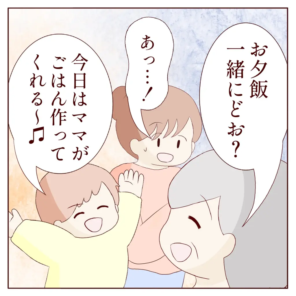 すると、「お夕飯一緒にどお?」と義母が言ってくれ、「あっ・・!」と驚いていると、「今日はママがごはん作ってくれる~」とコノハが義母に嬉しそうに言いました。
