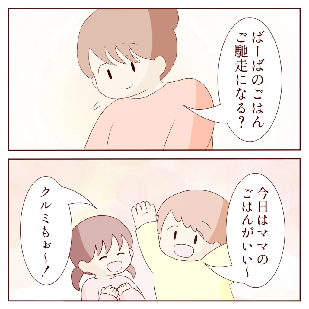 私が「ばーばのごはんご馳走になる?」と子ども達に聞くと、「今日はママのごはんがいい~」「クルミもぉ~!」と口を揃えて答える子ども達。