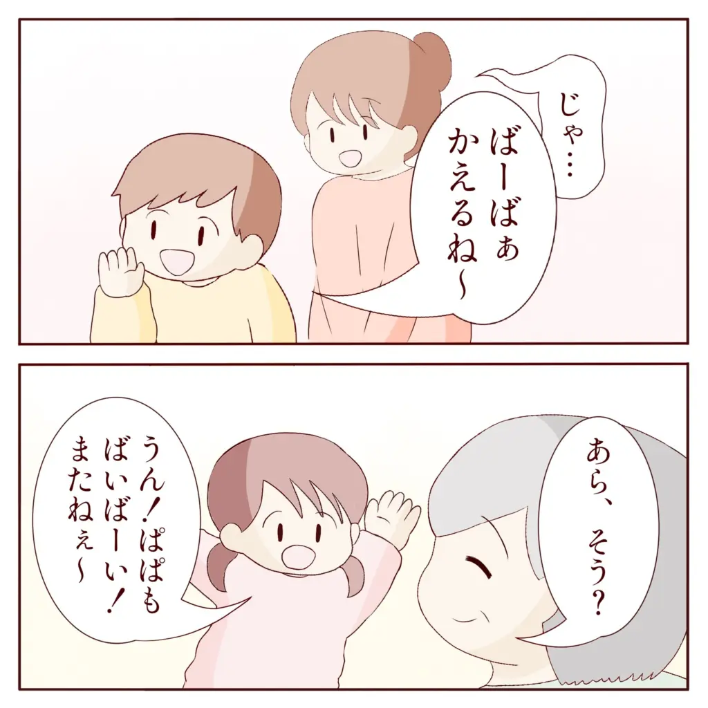 その言葉を聞いて、「じゃ・・」と言うと、「ばーばぁ、かえるね~」とコノハが言い、「あら、そう?」義母が笑顔でそう言うと、「うん!ぱぱもばいばーい!またねぇ~」と義母と、帰って来ない父親に別れを告げたのでした。