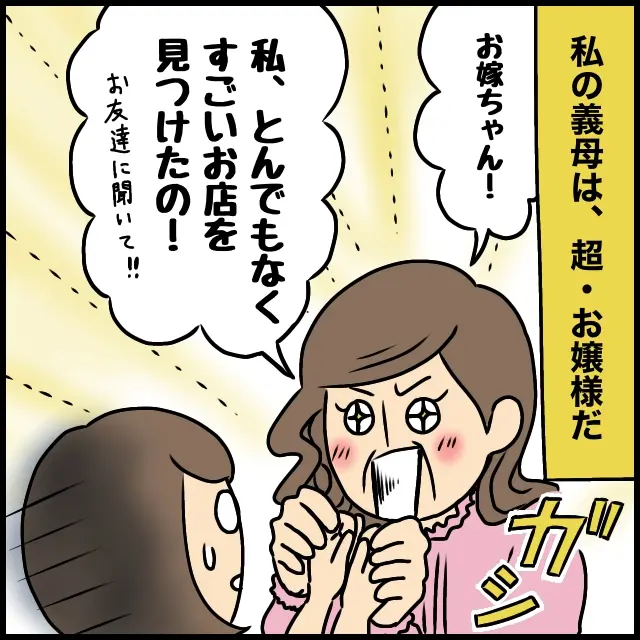 私の義母は超お嬢様育ち。庶民派の私には思考が全く追いつけず、唖然としてしまうこともしばしばです。でもいつも全力で好奇心旺盛な義母は憎めない人なのです。