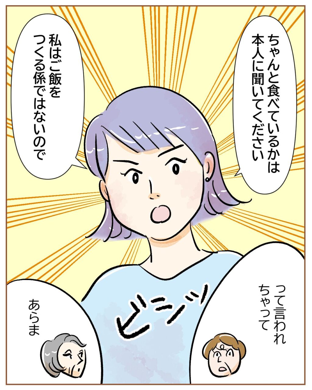 「タカシがちょっと痩せてて、『ちゃんと食べてるのかしら?』って聞いただけ。そしたら、」と義母が言葉を続けます。