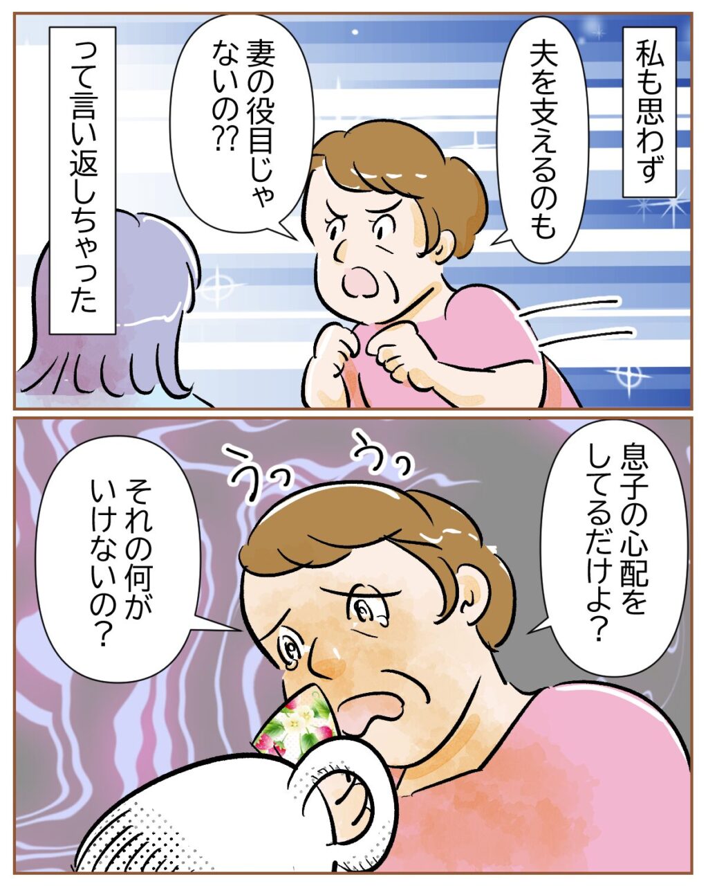 義母も思わず、「夫を支えるのも妻の役目じゃないの??」と言い返してしまい、「息子の心配をしてるだけよ?それの何がいけないの?」とお姉さんに涙ながらに訴えました。