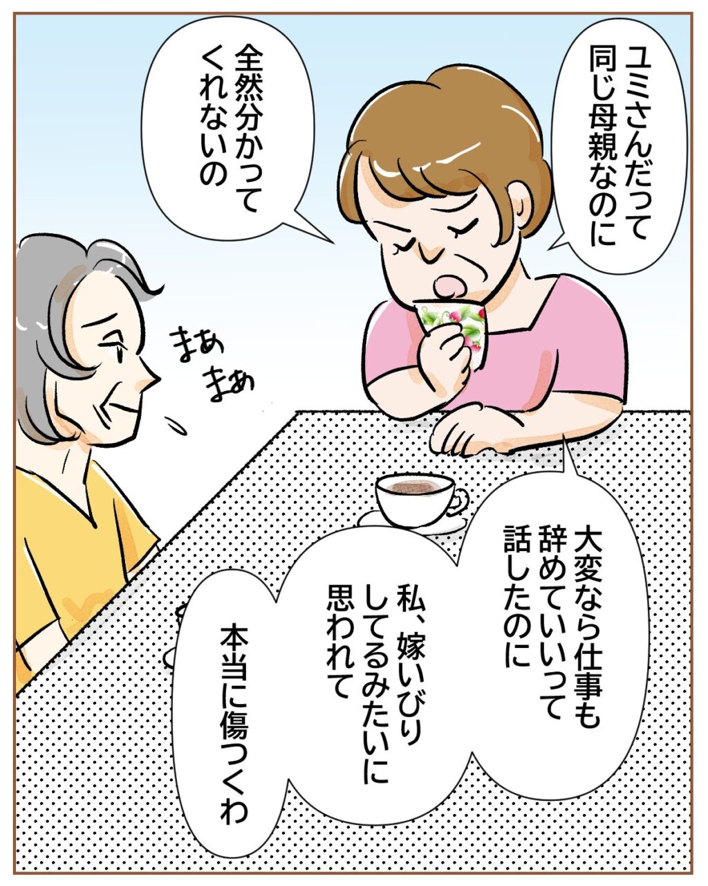 そして、「ユミさんだって同じ母親なのに、全然分かってくれないの。大変なら仕事も辞めていいって話したのに。私、嫁いびりしてるみたいに思われて、本当に傷つくわ」義母がそう言うと、「まあまあ」とお姉さんが慰めました。