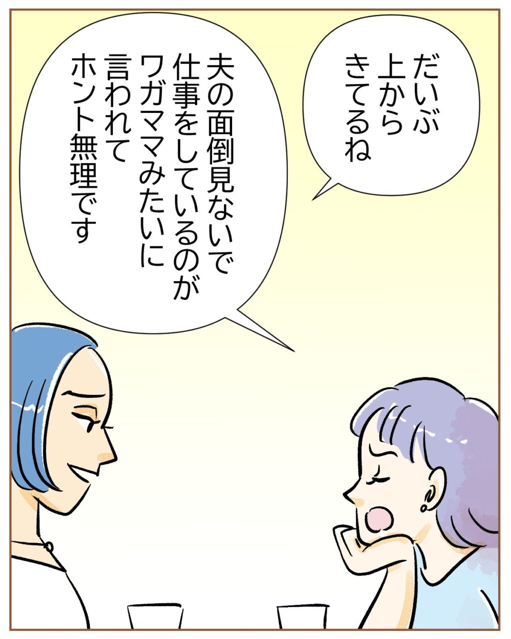 「だいぶ上からきてるね」と冷静に言う先輩。「夫の面倒見ないで仕事をしているのがワガママみたいに言われてホント無理です」と文句を言うユミさん。
