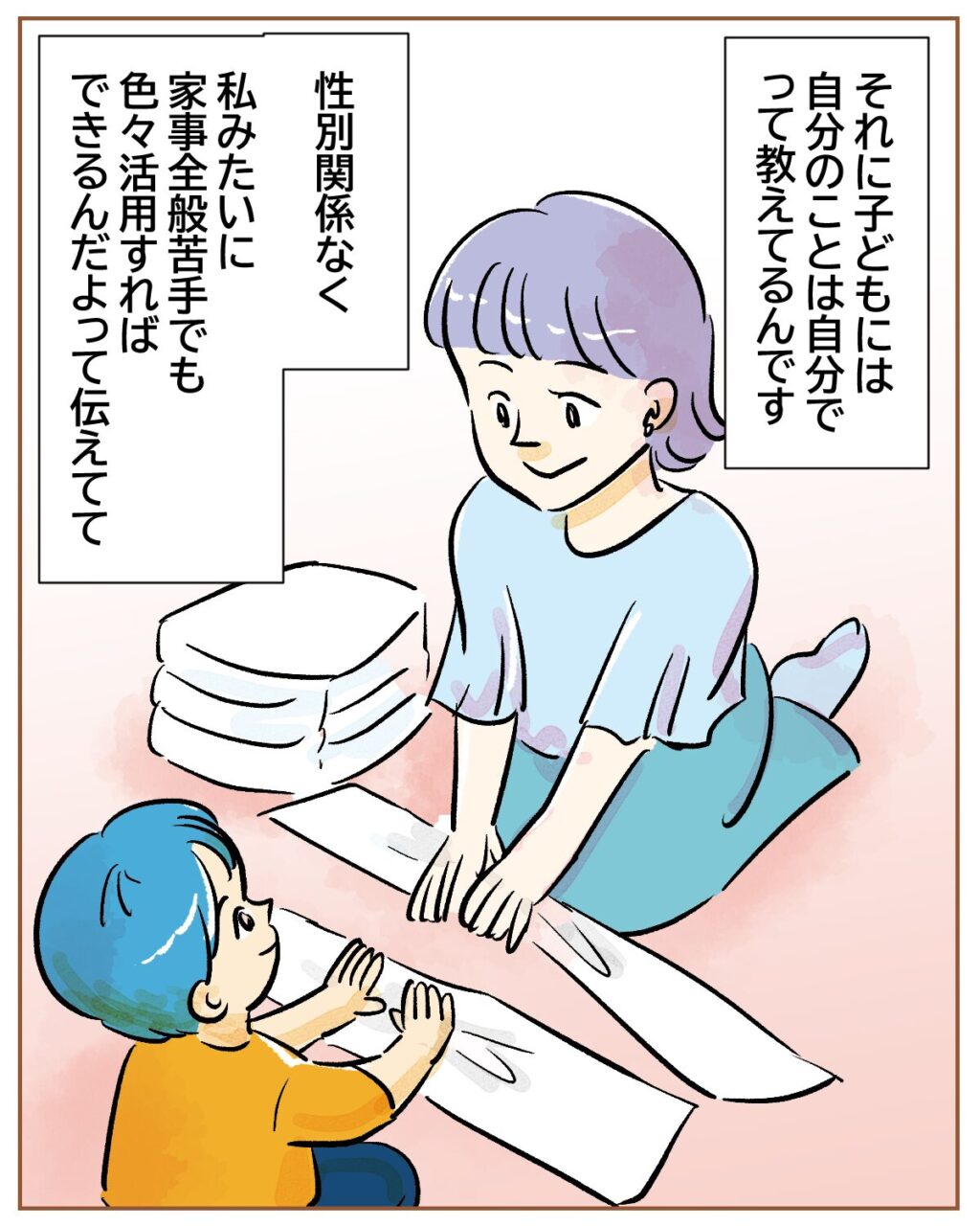 「それに、子どもには自分のことは自分で、って教えてるんです。性別関係なく、私みたいに家事全般苦手でも、色々活用すればできるんだよって伝えてて」と息子に対する思いを先輩に話すと、