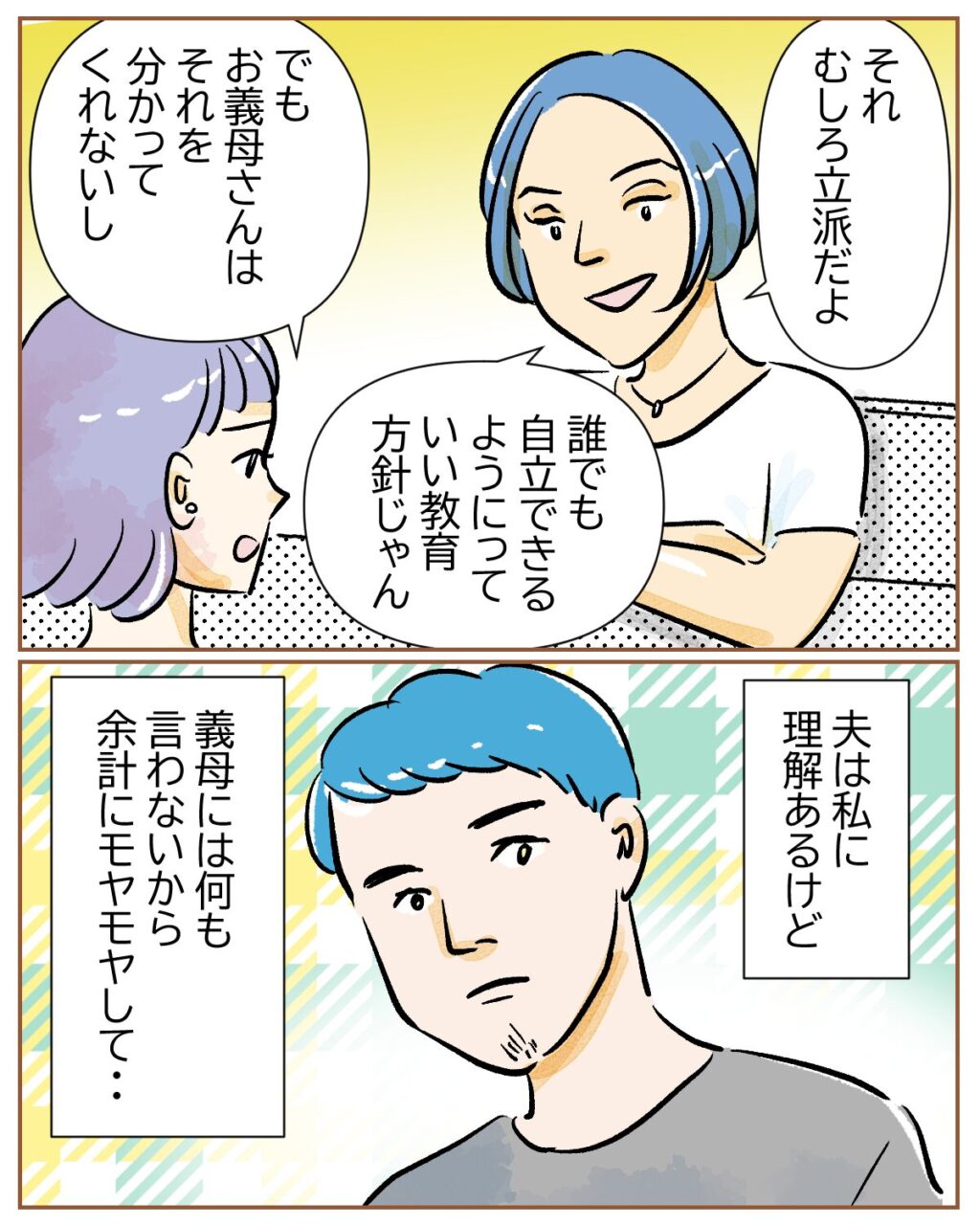 すると、「それ、むしろ立派だよ。誰でも自立できるようにっていい教育方針じゃん」ユミさんの方針を絶賛する先輩に、「でもお義母さんはそれを分かってくれないし」と不満を呟くと、「夫は私に理解あるけど、義母には何も言わないから余計にモヤモヤして・・」と義母だけの不満ではなく、夫へのモヤモヤも重なってきたのでした。