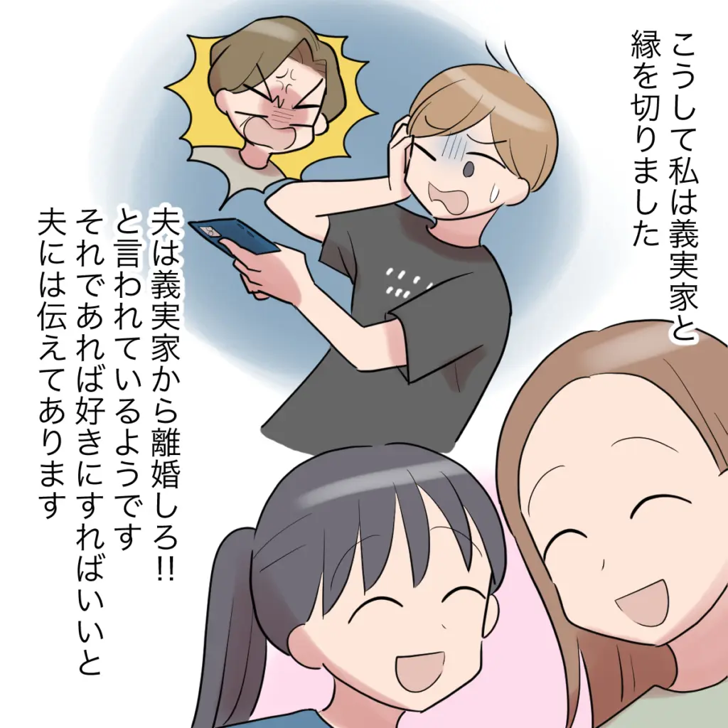 夫は義実家から「離婚しろ!!」と言われているようですが、それであれば好きにすればいいと夫には伝えてあります。