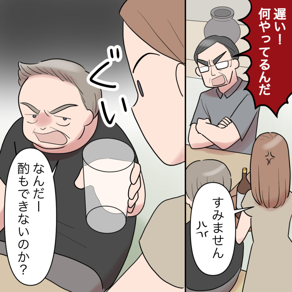 居間にビールやおつまみを持っていくと「遅い!何やってるんだ」と怒鳴られます。私は怒りを飲み込み「すみません」と答えます。頼まれたものを机に並べて台所へ戻ろうとしたその瞬間、親戚のおじさんがコップをこちらに突き出して「なんだ酌もできないのか?」と偉そうに言ってきました。