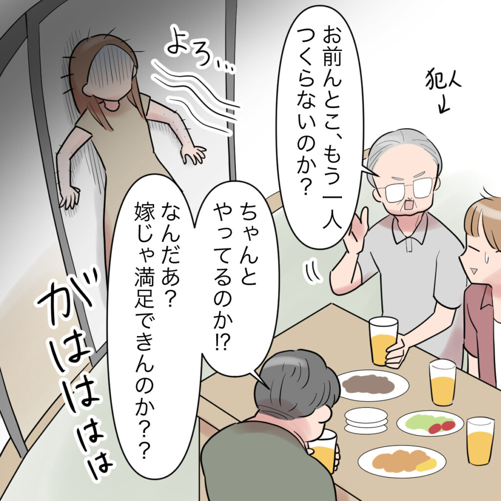義祖母の「夜の方はさせてるのか?」という一言を皮切りに、「もしミノルが浮気したら原因はあなたの至らなさ」「頑張らないと他所で子どもをこさえるぞ」と、好き放題言い始める義母と親戚のおばさん達。挙げ句の果てには「男の子を産めないなら離婚も考えないと」とため息をつかれます。男尊女卑のお手本のような発言に、私は思わず言葉を失いました。