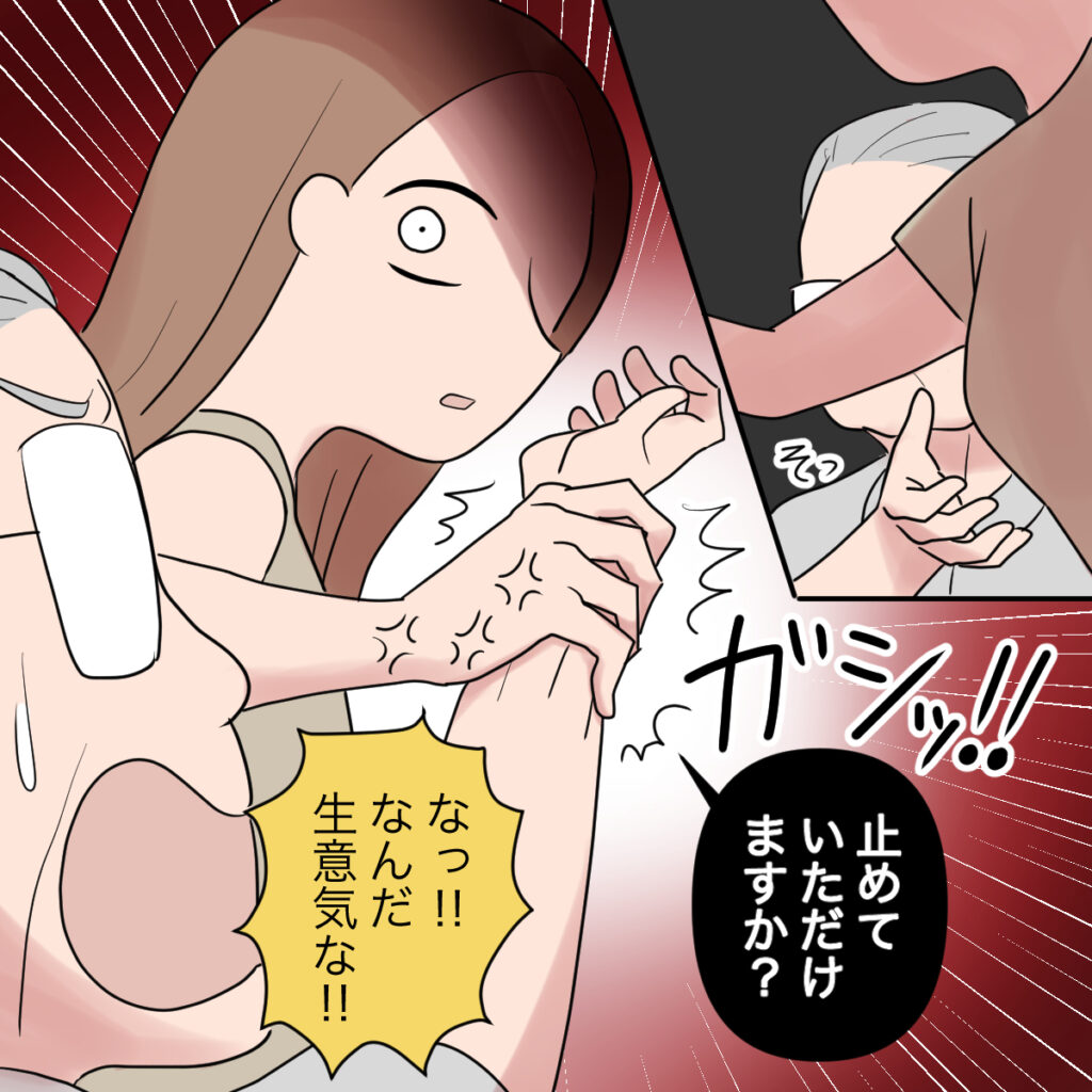 すると、さっきおしりを触ったおじさんが、そっと私の胸に手を伸ばそうと・・「やめていただけますか?」すかさず腕をガシッと掴んでそう言うと、「なっ!!なんだ生意気な!!」とおじさんが文句を言いました。