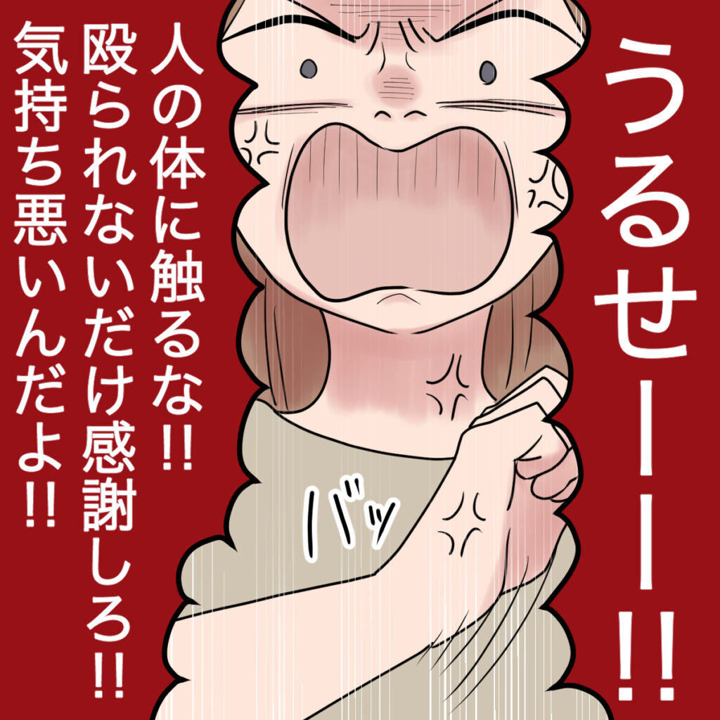 もう我慢の限界だった私は、「うるせーー!!人の体に触るな!!殴られないだけ感謝しろ!!気持ち悪いんだよ!!」と腕を振り払ってそう叫ぶと、