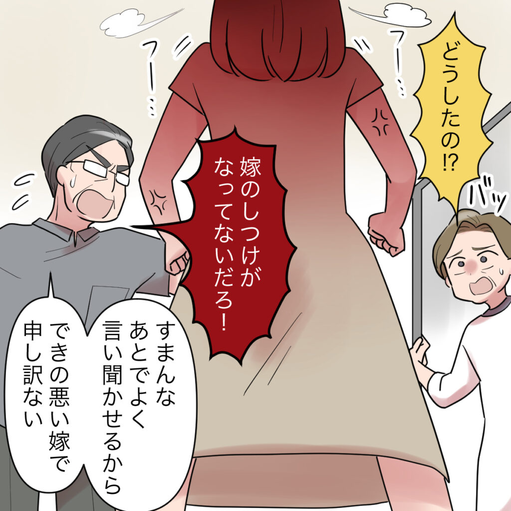 大声に驚いた義母が顔を出し、「どうしたの!?」と言いました。「嫁のしつけがなってないだろ!」親戚の声を聴いて、「すまんな。あとでよく言い聞かせるから。できの悪い嫁で申し訳ない」義父が慌てて親戚のおじさんたちに謝ると、