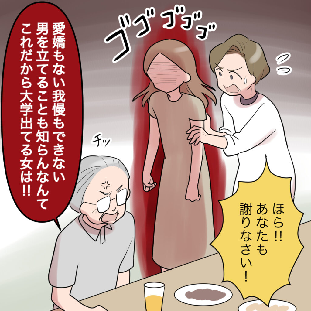 「ほら!!あなたも謝りなさい!」義母がやって来て、私の腕を掴みおじさんのところへと連れて行きました。すると、「愛嬌もない、我慢もできない、男を立てることも知らんなんて、これだから大学出てる女は!!」と男尊女卑を振りかざし悪口を言うのでした。