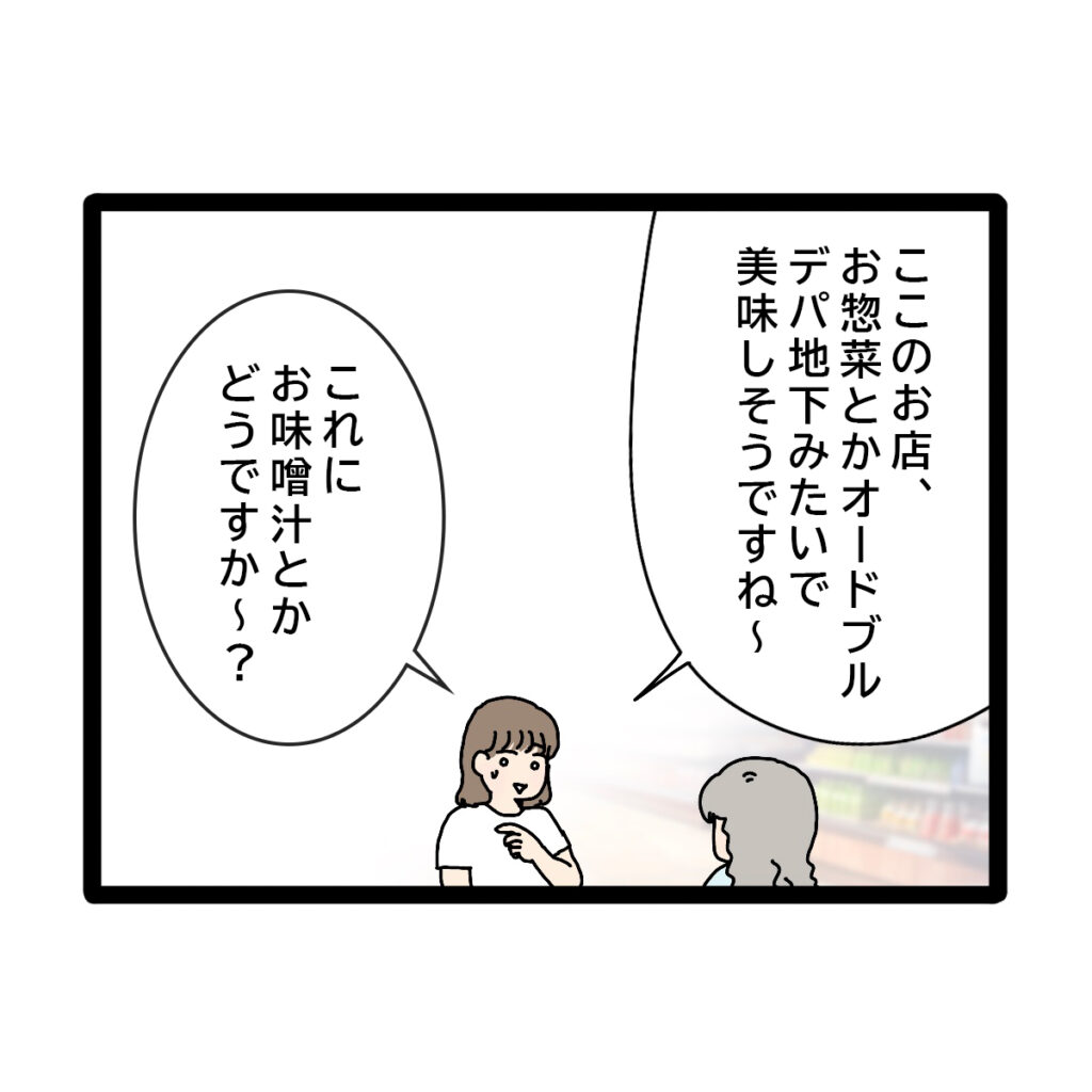 「ここのお店、お惣菜とかオードブル、デパ地下みたいで美味しそうですね~。これに、お味噌汁とかどうですか~?」私がそう言うと、