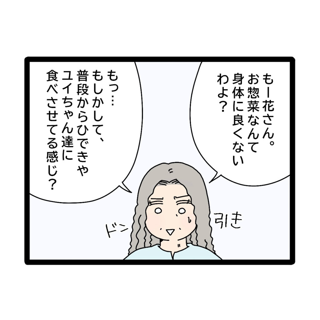 「もー花さん。お惣菜なんて身体に良くないわよ?もっ・・もしかして、普段からひできやユイちゃん達に食べさせてる感じ?」とドン引きしながら言う義母に、