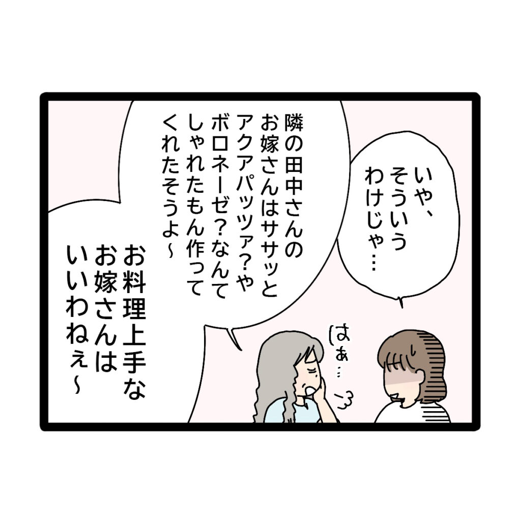 「いや、そういうわけじゃ・・」と答えると、「隣の田中さんのお嫁さんは、ササっとアクアパッツァ?やボロネーゼ?なんてしゃれたもん作ってくれたそうよ~。お料理上手なお嫁さんはいいわねぇ~」とため息をつきながら義母が言い、