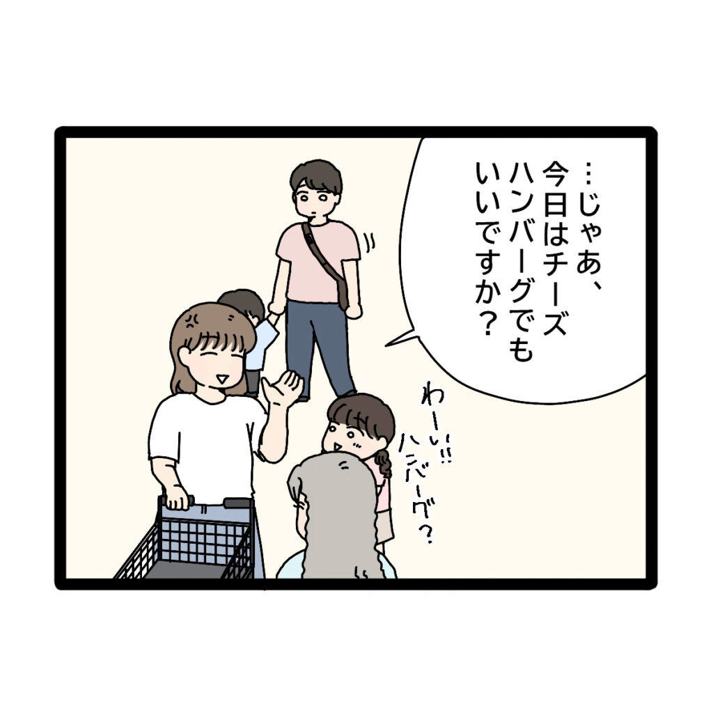 「・・じゃあ、今日はチーズハンバーグでもいいですか?」義母にそう言うと、話を聞いていたユイちゃんが「わーい!!ハンバーグ?」とうれしそうに言いました。