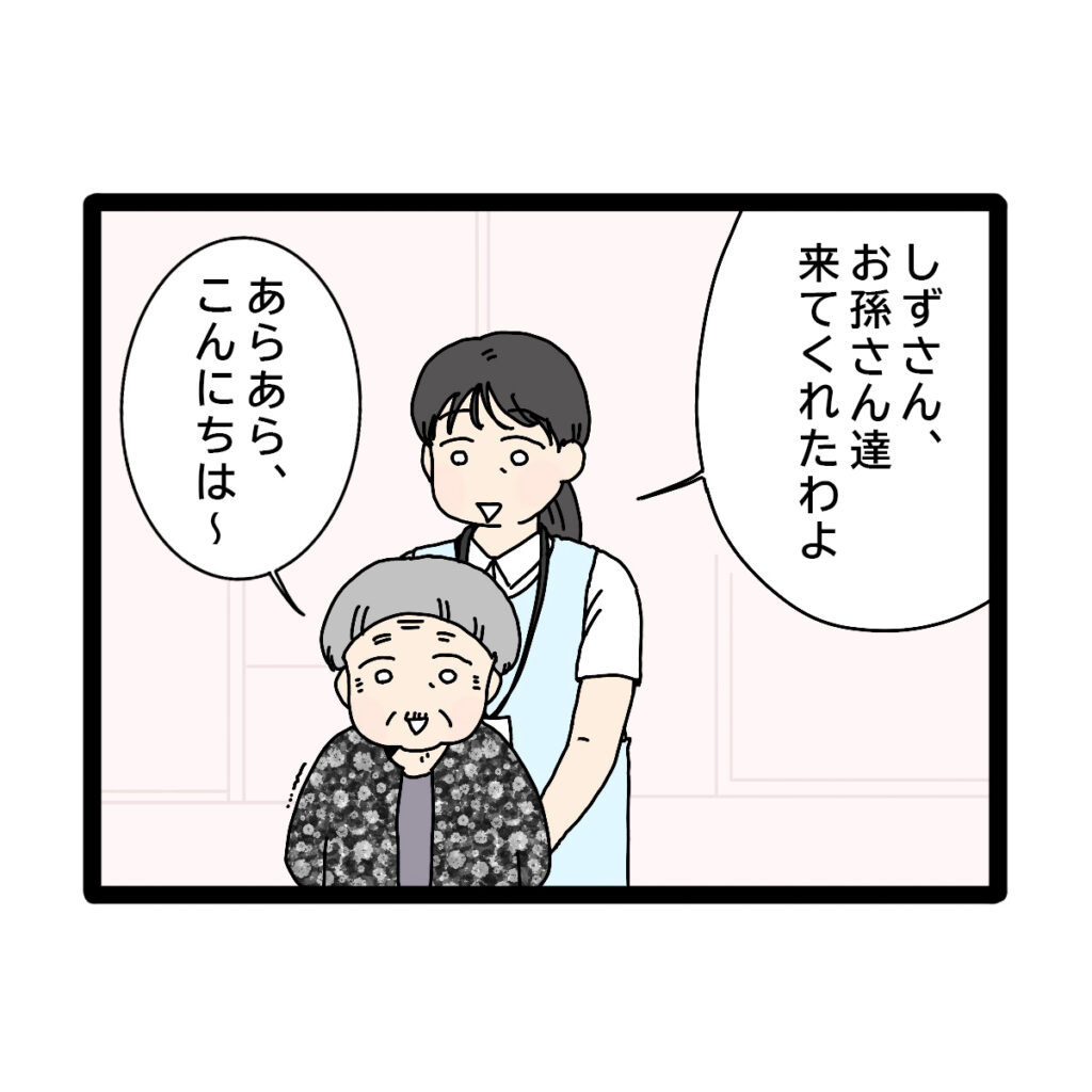 施設の方に「しずさん、お孫さん達、きてくれたわよ」と言われてにっこりと「あらあら、こんにちはあ~」と言ってくれるこの女性は。