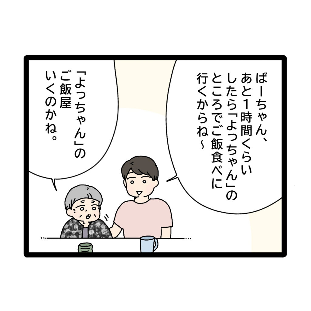 そして、「ばーちゃん、あと1時間くらいしたら『よっちゃん』のところでご飯食べに行くからね~」夫がそう言うと、「『よっちゃん』のご飯屋いくのかね」とおばあちゃん。