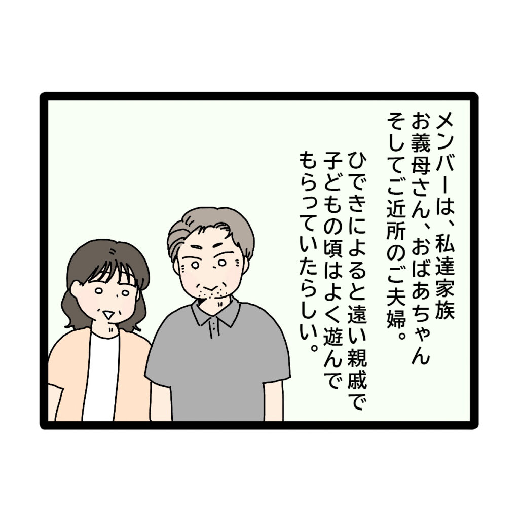メンバーは、私達家族、お義母さん、おばあちゃん、そしてご近所のご夫婦。夫が言うには、遠い親戚で、子どもの頃はよく遊んでもらっていたとのことでした。