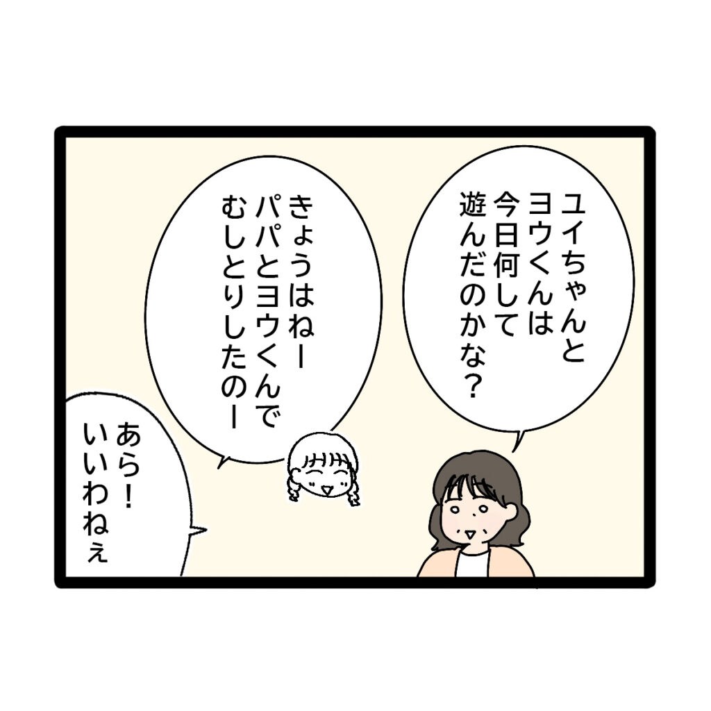 すると、「ユイちゃんとヨウくんは今日何して遊んだのかな?」ご近所の奥さんにたずねられ、「きょうはねー、パパとヨウでむしとりしたのー」ユイが答えると、「あら!いいわねぇ」と答える奥さんに、