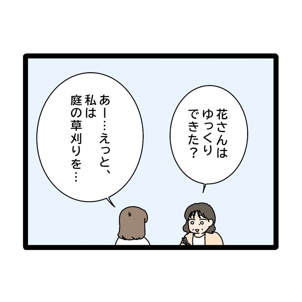 「花さんはゆっくりできた?」と聞かれ、「あー・・えっと、私は庭の草刈りを・・」と控えめにそう答えると、