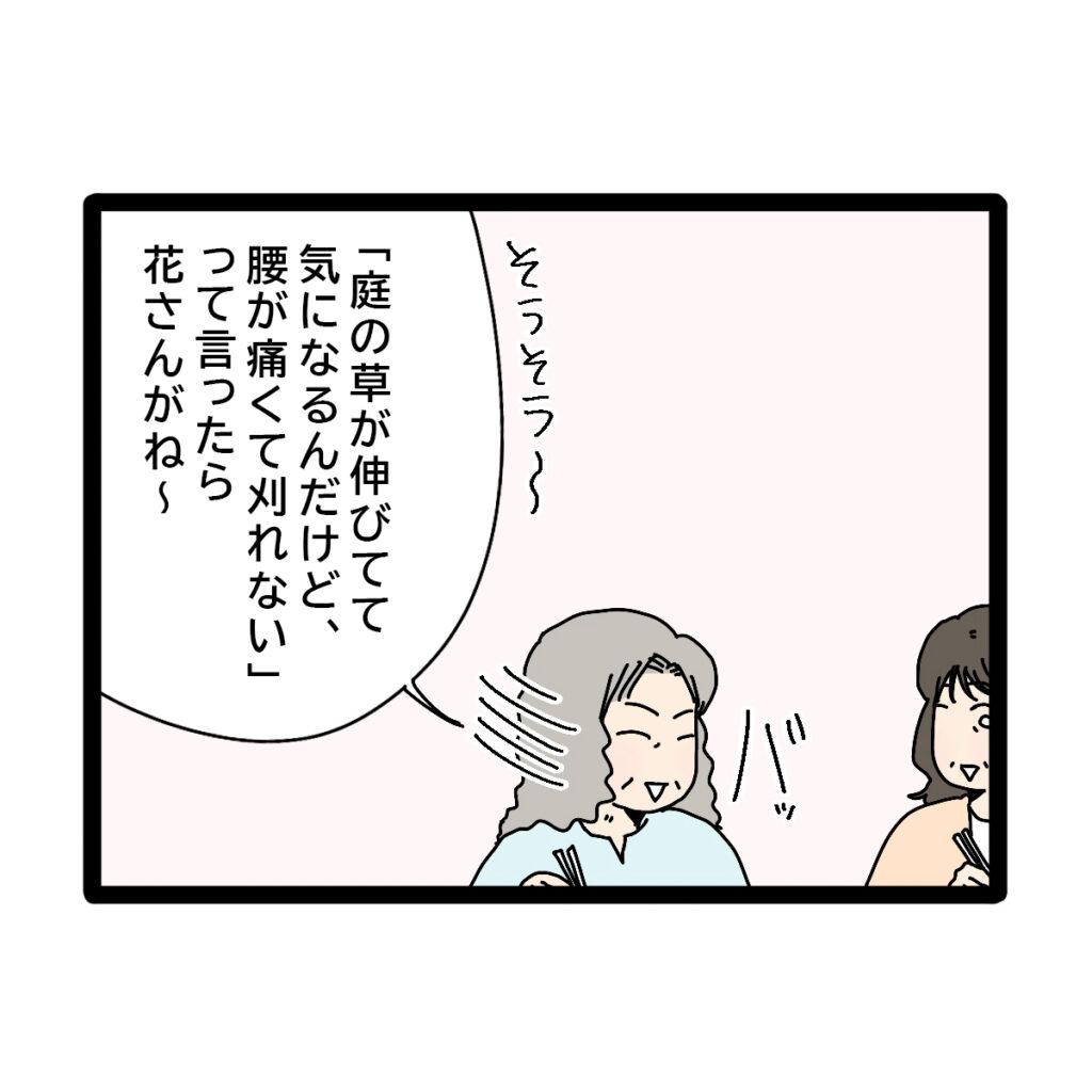 「そうそう~。『庭の草が伸びてて気になるんだけど、腰が痛くて刈れない』って言ったら花さんがね~」と義母が口を挟み、