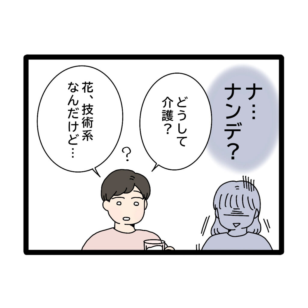 突然のことで「な・・なんで?」と呆然としていると、「どうして介護?花、技術系なんだけど・・」と頭をひねりながら夫が言いました。