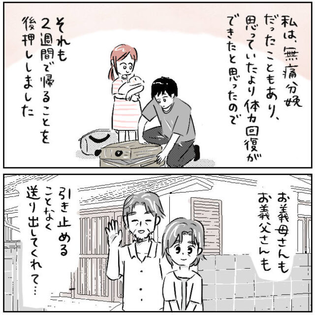 お義母さんもお父さんも、引き止めることなく送り出してくれて、いよいよ自宅に帰る日のこと、