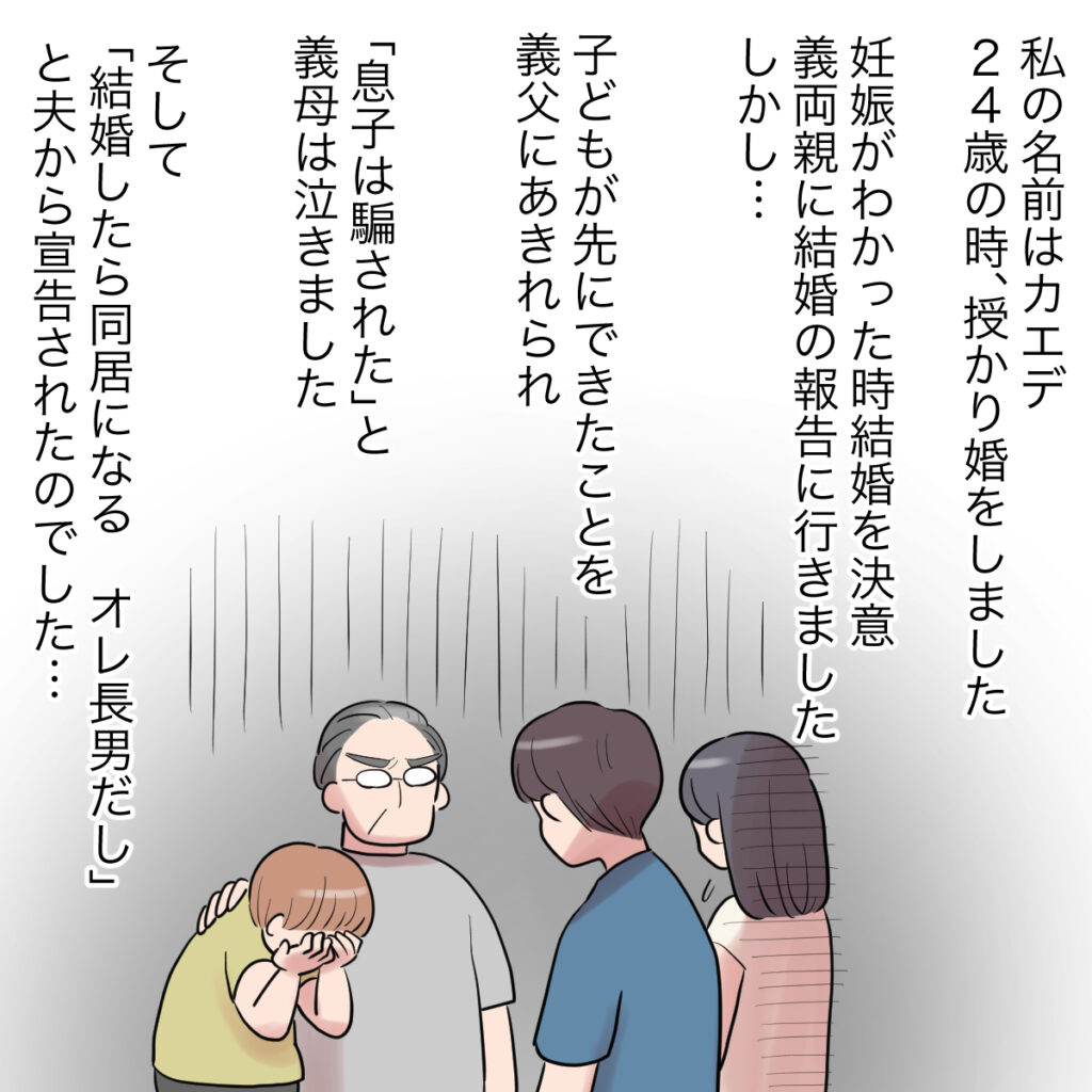 私の名前はカエデ。24歳のときに夫ユウタと授かり婚をしました。妊娠がわかった時に結婚を決意し、すぐに義両親に結婚の報告に行ったのですが、祝福はされませんでした。義父には子どもが先にできたことを呆れられ、義母には「息子は騙された」と泣かれました。そして、「結婚したら同居になる。オレ長男だし」とユウタから決定事項として告げられたのでした。