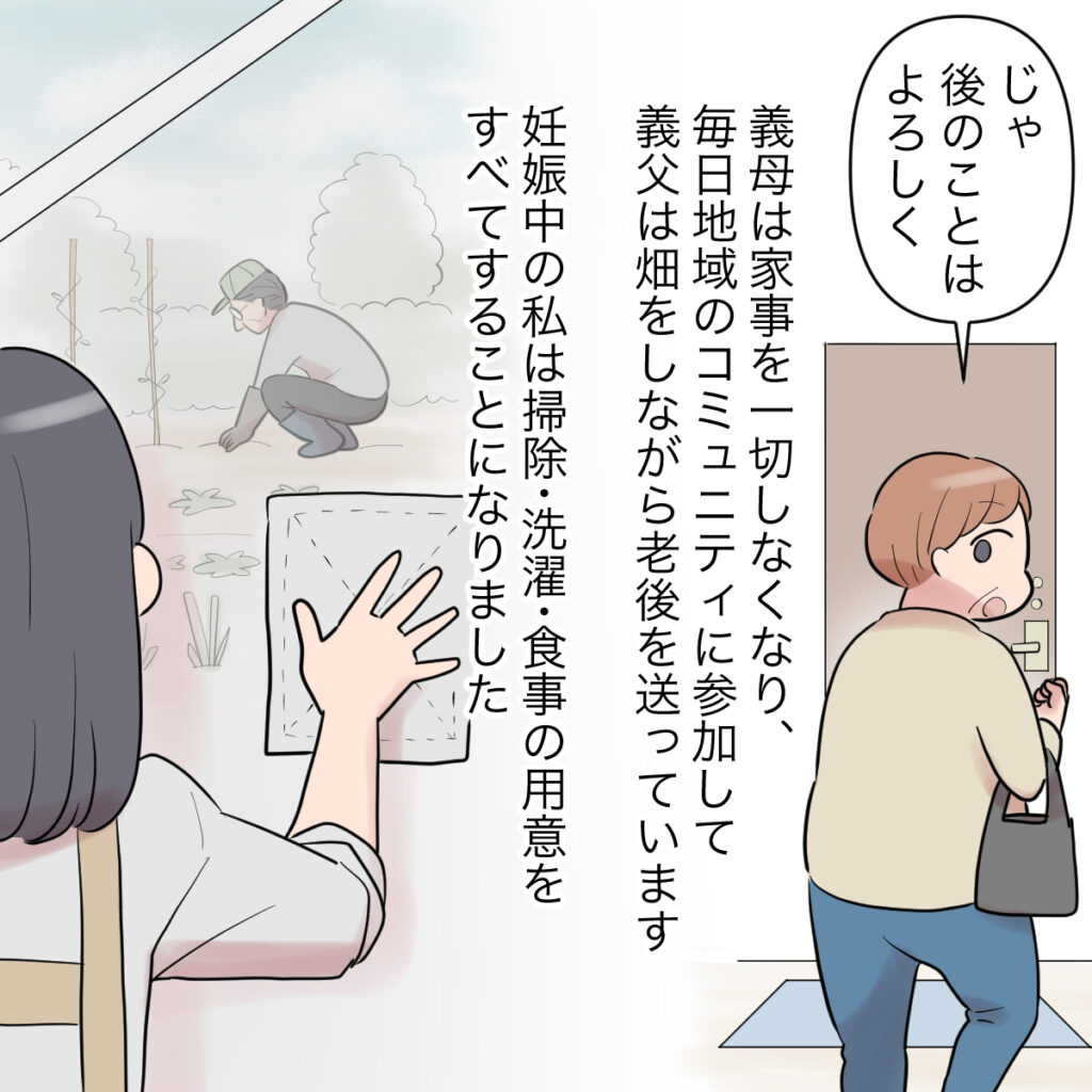 同居生活が始まると、義母は家事を一切しなくなりました。「じゃ、後のことはよろしく」と毎日地域のコミュニティに出かけ、定年退職している義父は畑をしながら老後を送る日々。掃除、洗濯、家族全員分の食事の用意などの家事はすべて妊娠中の私の仕事になりました。