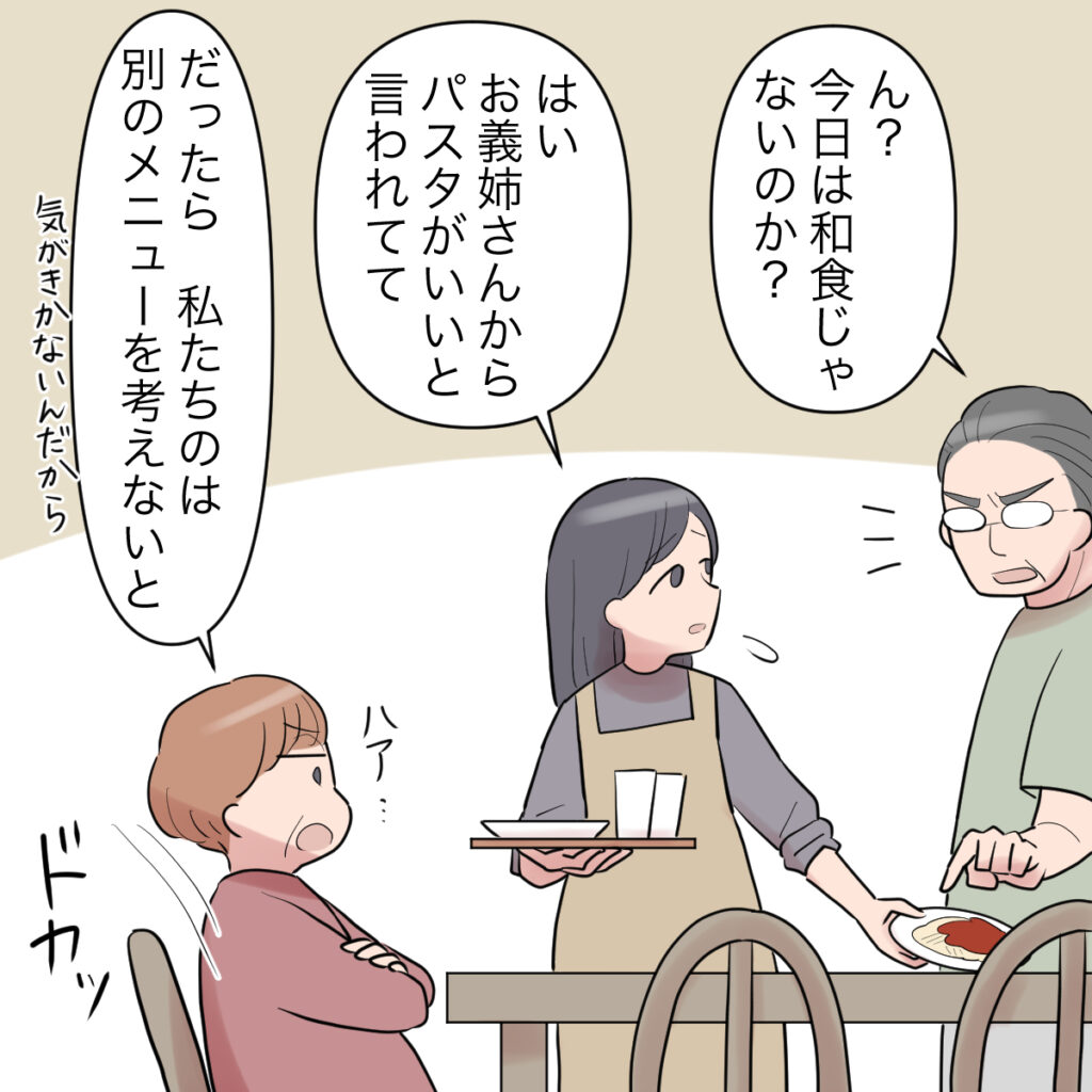 ある日、夕食にパスタを出すと「ん?今日は和食じゃないのか?」と義父から不満そうに言われたので「はい。お義姉さんからパスタがいいと言われてて」と答えると、義母が溜息をつきながら「だったら私たちのは別のメニューを考えないと。気が利かないんだから」と言ってドカッと椅子に座りました。