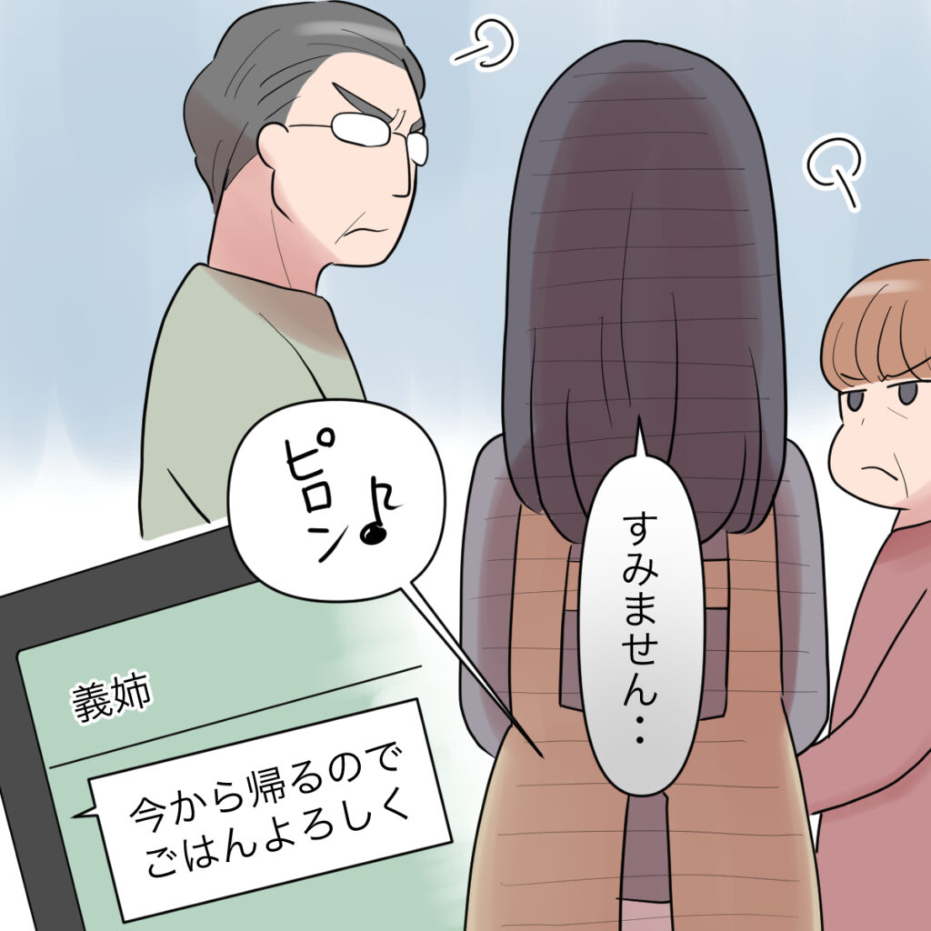 二人から不満を言われ「すみません・・」と謝るしかない私のポケットでピロンとスマホが鳴りました。お義姉さんからの「今から帰るのでごはんよろしく」というメッセージでした。