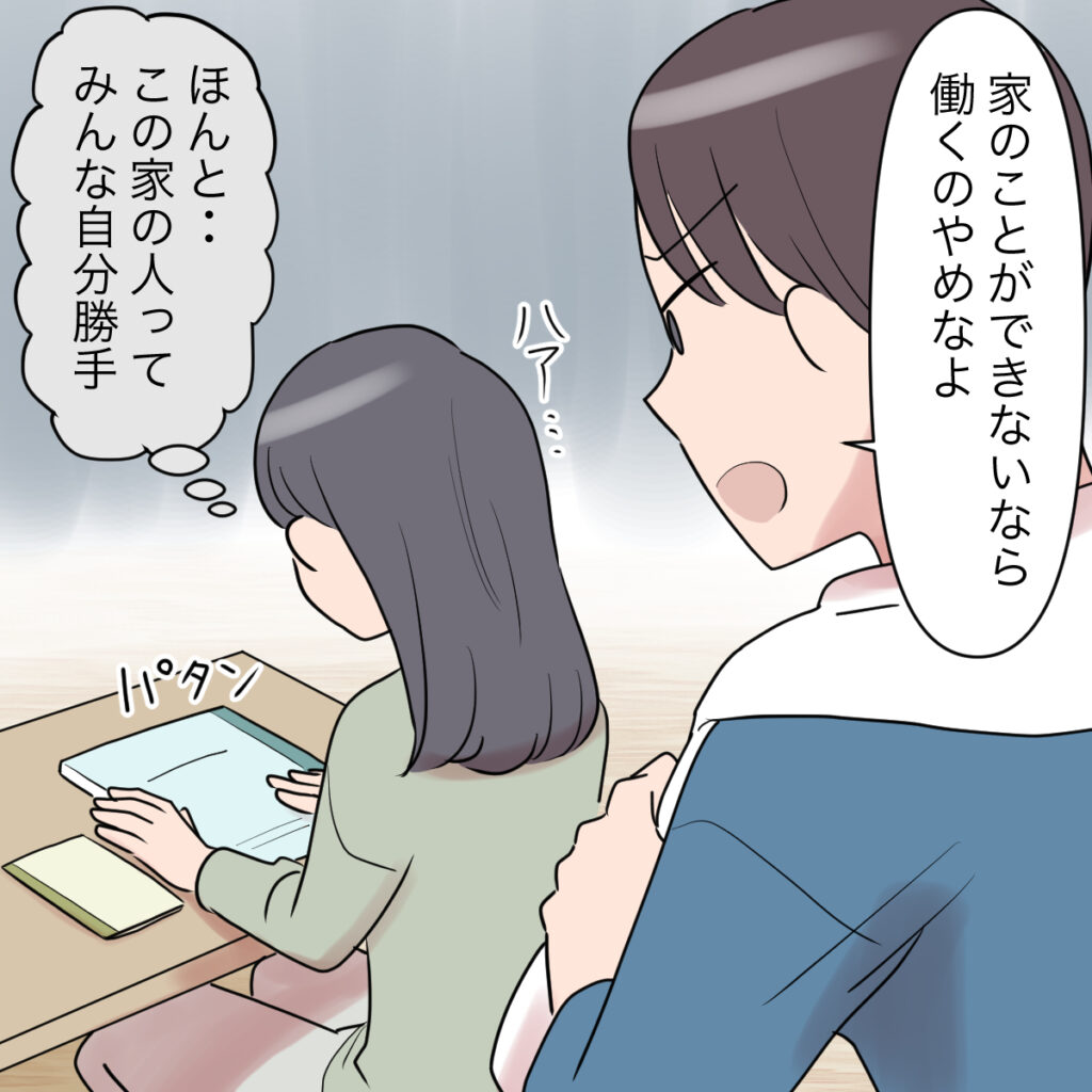 これまでのように家事はできなくなると宣言した私に、その時は塾代を稼いでほしいことしか考えておらず「少しくらいは目を瞑る」と上から目線で言っていたユウタは、私が必要最低限の家事しかしなくなったことで目に見えて散らかりだした家や自分の事を自分でしなくてはならない現状に不満のようで「家のことができないなら働くのやめなよ」と言ってきたのです。この家の人たちの自分勝手さに呆れました。