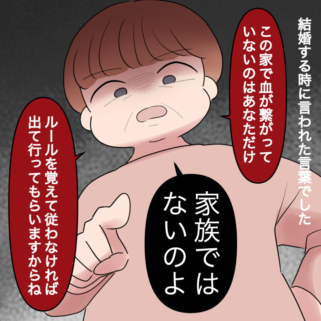義母は授かり婚が決まった時に、怖い顔で「この家で血が繋がっていないのはあなただけ。家族ではないのよ。ルールを覚えて従わなければ出て行ってもらいますからね。」と怖い顔で宣言したのでした。当時は産まれてくる子のことを考えて、言われるがままにしてきてしまった私。でも今は違います。