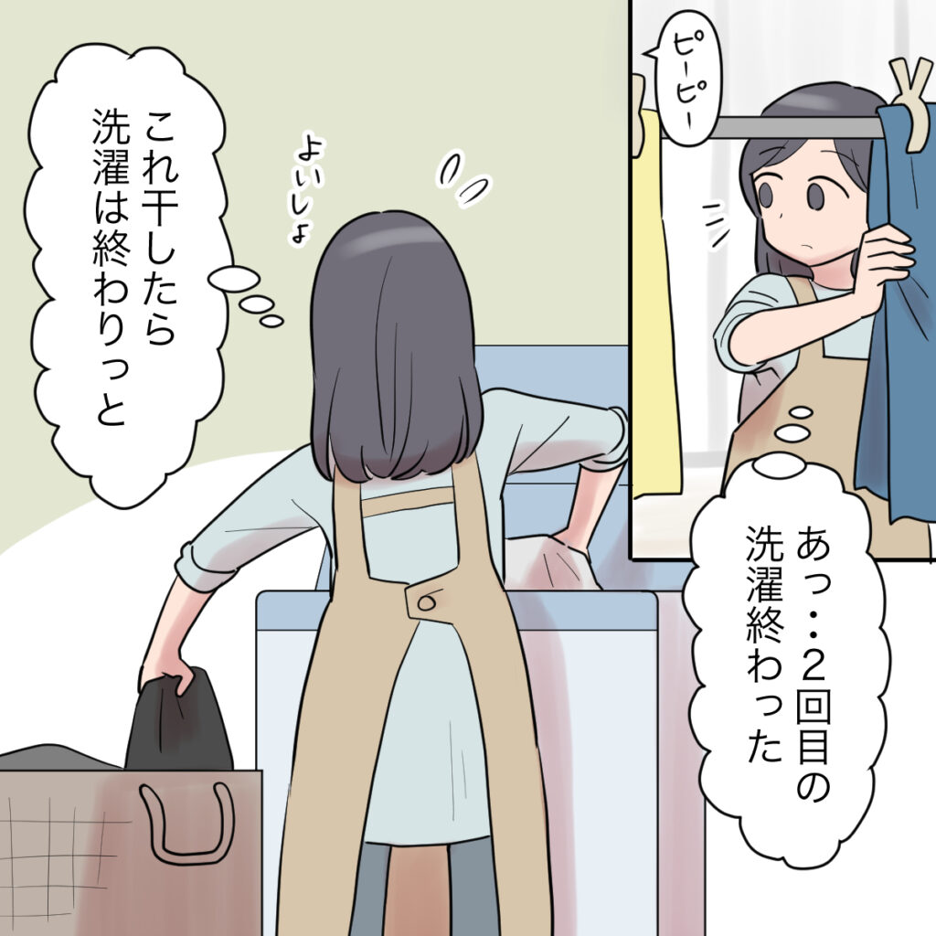 ある日、洗濯物を干していると、ピーピーと音が。「あっ・・2回目の洗濯終わった」と思い、洗濯機から取り出しながら、「よいしょっ、これ干したら洗濯は終わりっと」