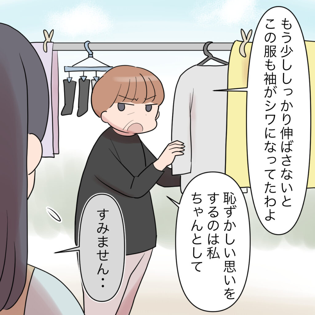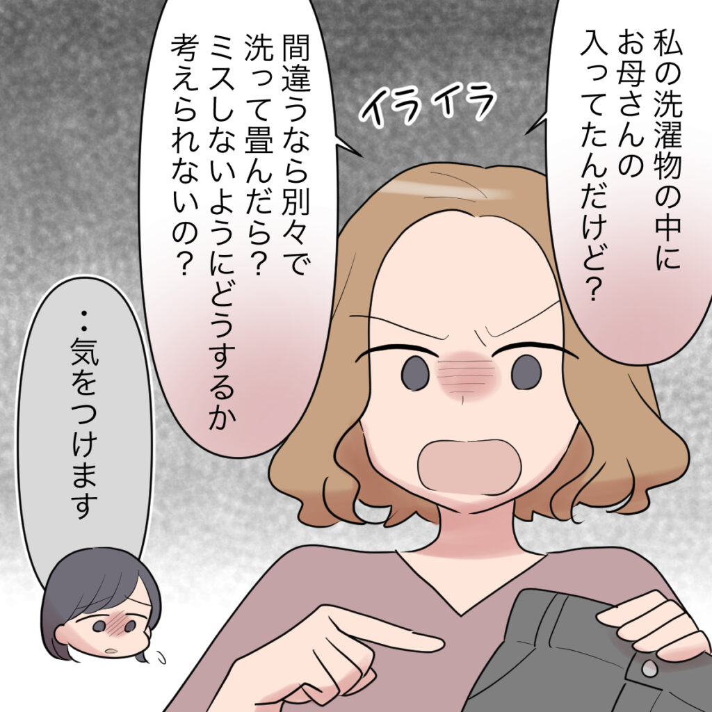 「私の洗濯物の中に、お母さんの入ってたんだけど?間違うなら別々で洗って畳んだら?ミスしないようにどうするか考えられないの?」イライラしながら言う義姉に、「・・気をつけます」と申し訳ない気持ちで謝りました。