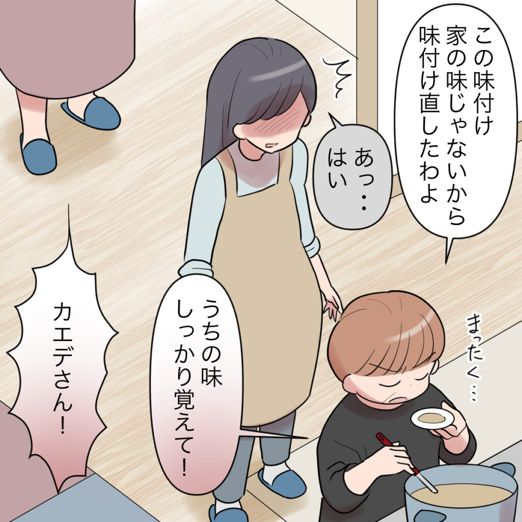 その後キッチンでは、「この味付け、家の味じゃないから味付け直したわよ。まったく・・」と言われ、「あっ・・はい」と言うと、「うちの味、しっかり覚えて!」と義母のキツい言葉が。すると、「カエデさん!」とまた私を呼ぶ声が。