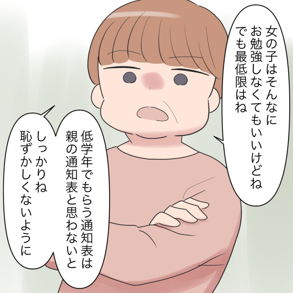 義母は女の子のフウカはそれほど勉強をしなくてもよいという考えのようです。「でも最低限はね。」ということばに続けて、「低学年でもらう通知表は親の通知表と思わないと。しっかりね。恥ずかしくないように」とくぎを刺しました。