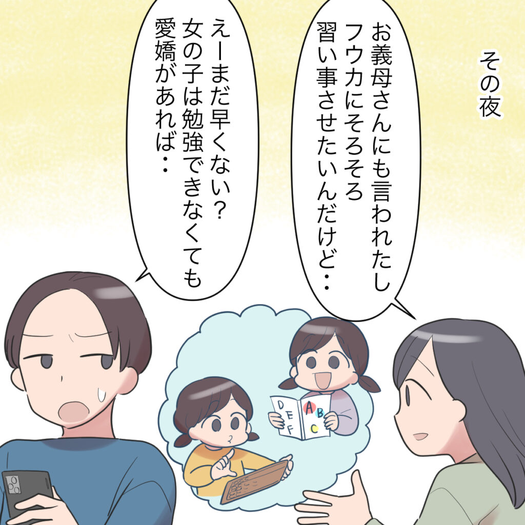 夜になって、そろそろフウカに習い事をさせたいとユウタに相談しましたが、ユウタは「まだ早くない?」とあまり乗り気ではない様子です。「女の子は勉強できなくても愛嬌があれば・・・」と、いつの時代かと突っ込みたくなるようなことを言いました。