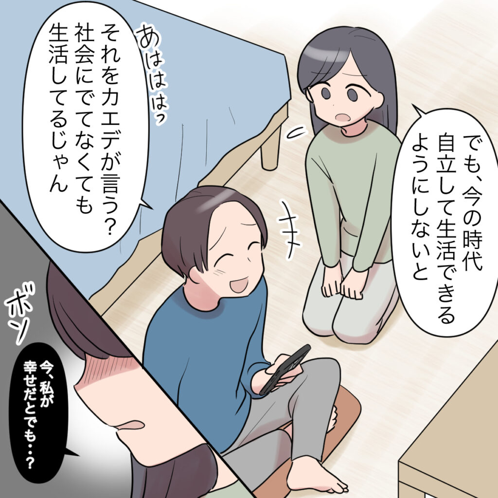 「でも、今の時代自立して生活できるようにしないと」と、フウカの将来を思う気持ちと自分への後悔も含めて伝えた私の言葉を、ユウタは笑い飛ばしました。「社会に出てなくても生活してるじゃん」と、専業主婦の私を見下した笑いです。「今、私が幸せだとでも・・・?」思わず言葉がこぼれ落ちてしまいました。