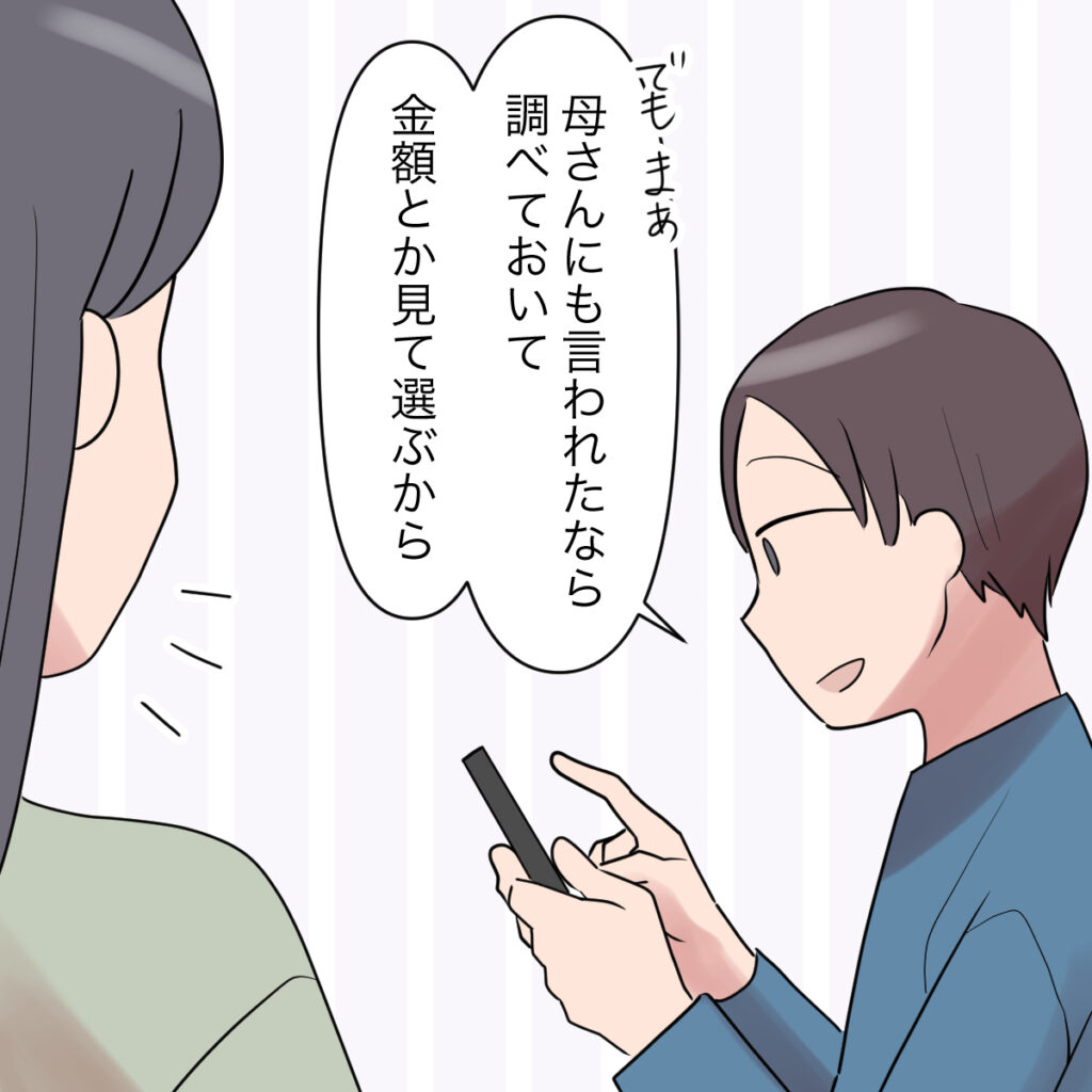私の言葉など聞いてもいないのか気にしていないのかはわかりませんが、ユウタは「でもまぁ、母さんにも言われたなら調べておいて。金額とか見て選ぶから。」と、スマホから目を離さず言いました。義母が言ったから・・・フウカのためとか、私の意見を聞いたわけではないのだなと思いました。