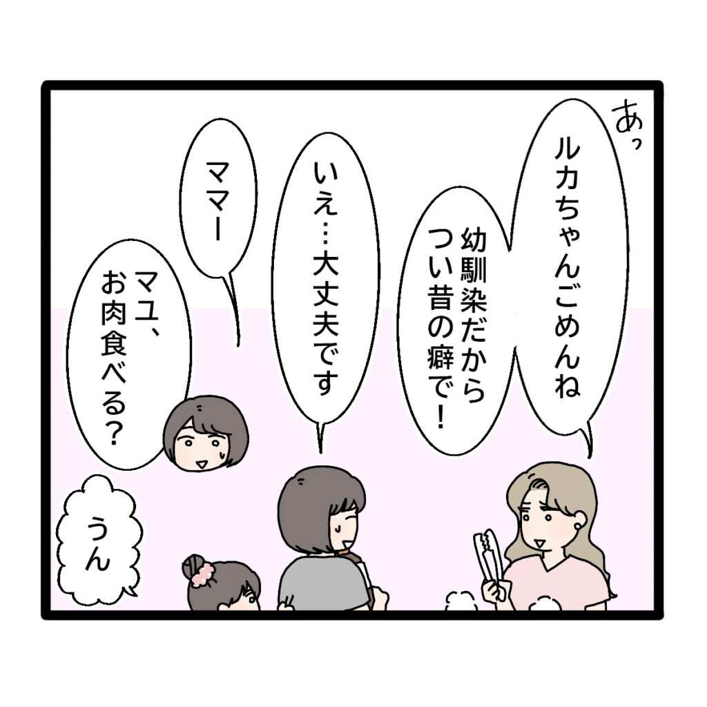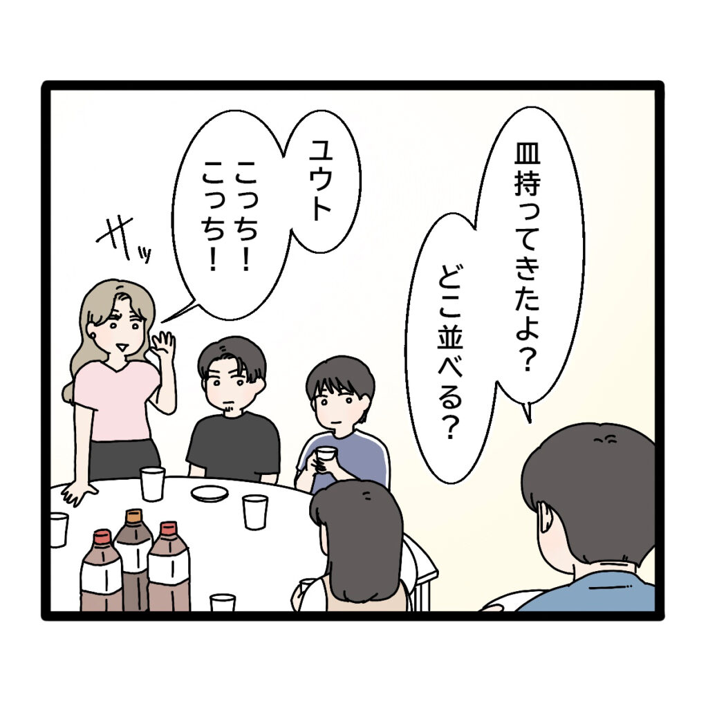 私はマユのお肉を焼いていましたが、ユキさんの様子はちゃんと見えていました。ユキさんはお皿を運んできて「どこ並べる?」と言っているユウトに、「こっちこっち!」とテーブルから声をかけました。