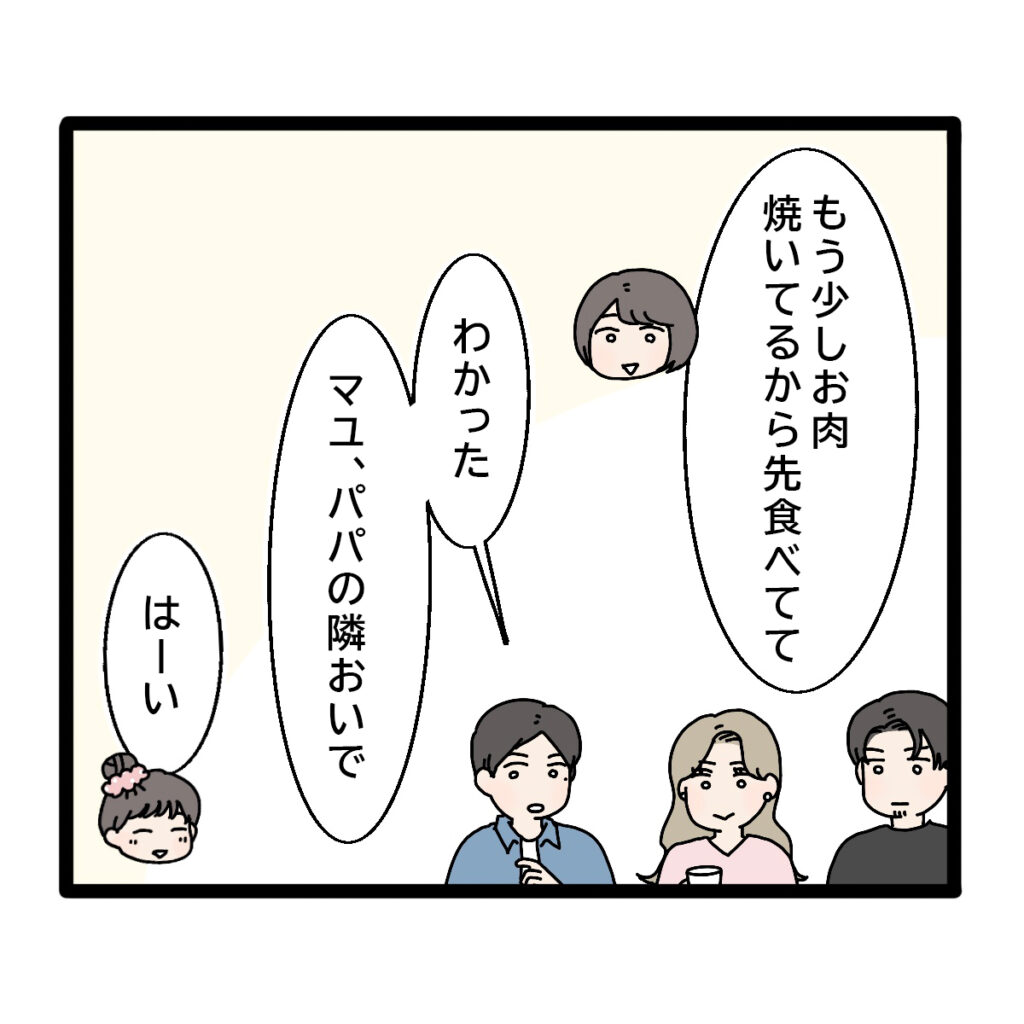 「もう少しお肉焼いてるから先食べてて」と私が答えると、ユウトはマユを自分の隣の席に呼んで食べ始めました。