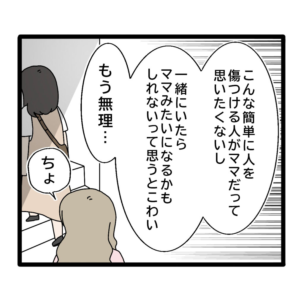 娘のサクラが、ルカさんの家から帰宅するなり「ママと家族やめる」と宣言しました。なぜルカさんなんかに謝りに行ったのよ!?しかも「こんな簡単に人を傷つける人がママだって思いたくないし。一緒にいたらママみたいになるかもしれないって思うとこわい。もう無理・・」と言って階段を上がって行くサクラを引き留めようとしましたが、サクラは振り向きもしませんでした。
