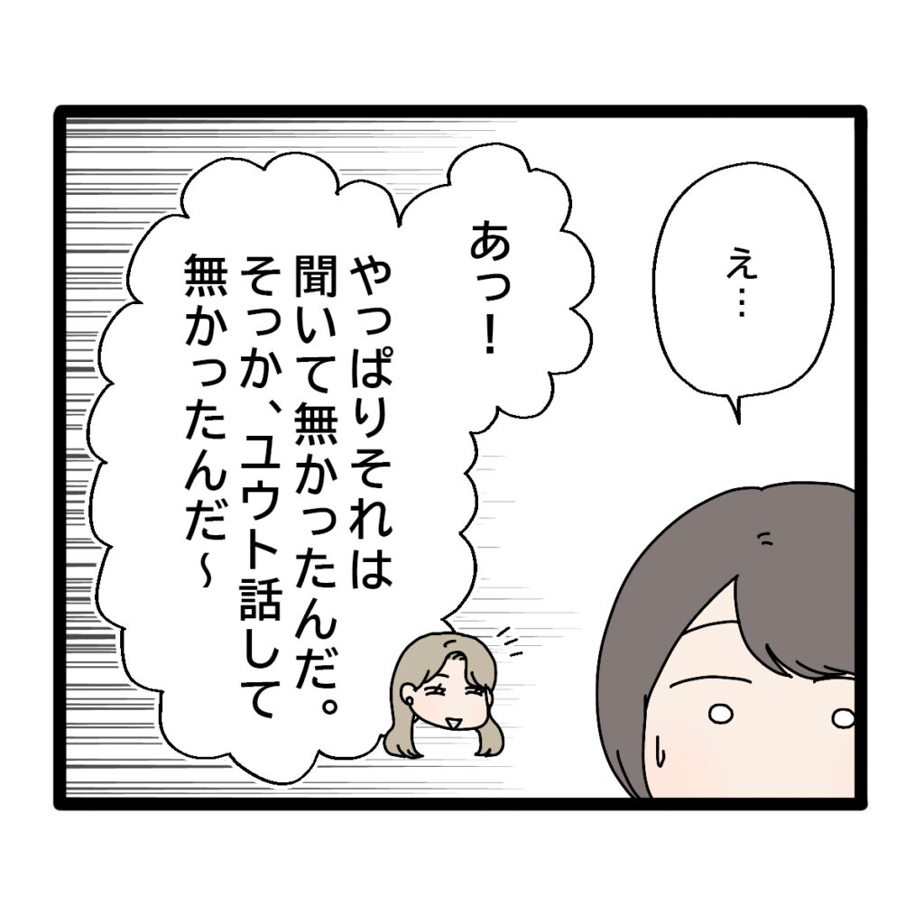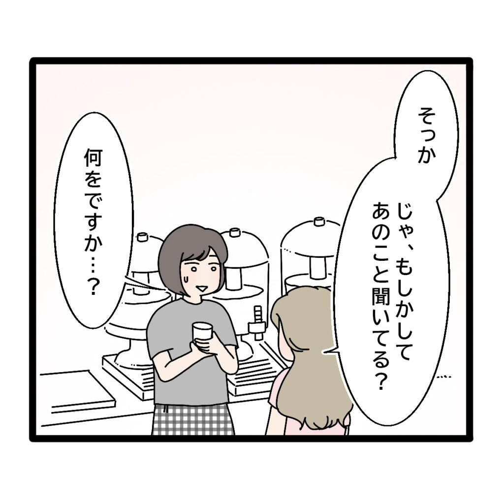 私の反応を見て、ユキさんは「そっか。じゃ、もしかしてあのこと聞いてる?」と意味深に言ってきました。気にしてないと言ったのがダメだったのかな。「何をですか?」と返しながら私は思いました。