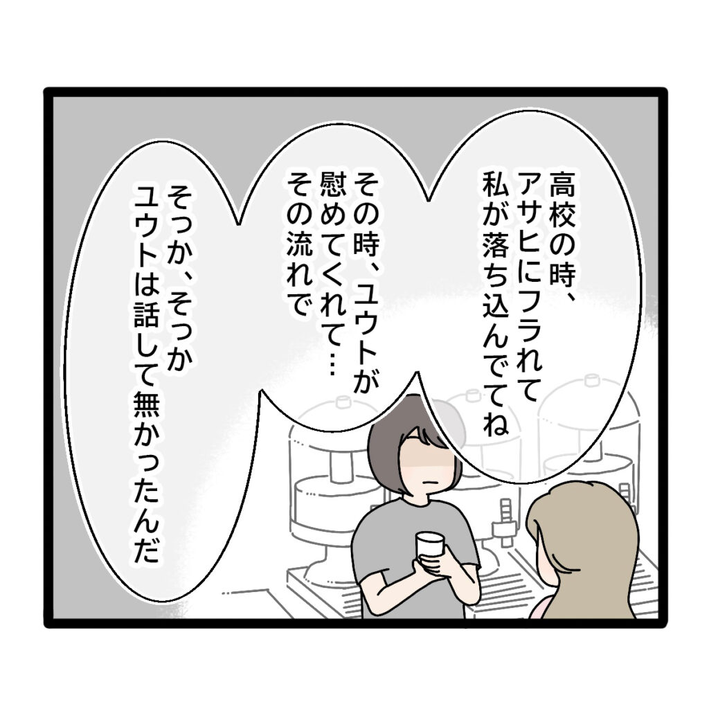 「高校の時、アサヒにフラれて私が落ち込んでてね。その時、ユウトが慰めてくれて・・・その流れで。そっかそっか、ユウトは話してなかったんだ。」って、そんな詳細なんて私が聞く必要あるのかな。私は無言のまま立ち尽くしていました。