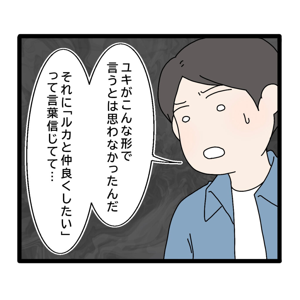 「ユキがこんな形で言うとは思わなかったんだ。」とユウトは言いました。「それに『ルカと仲良くしたい』って言葉信じてて・・・」ユウトの言葉に嘘は無いと思います。でも、ルカさんの態度を見ていて私と仲良くしたいと本当に思っていると感じたのかな、と私はユウトの鈍感さにも呆れてしまいました。