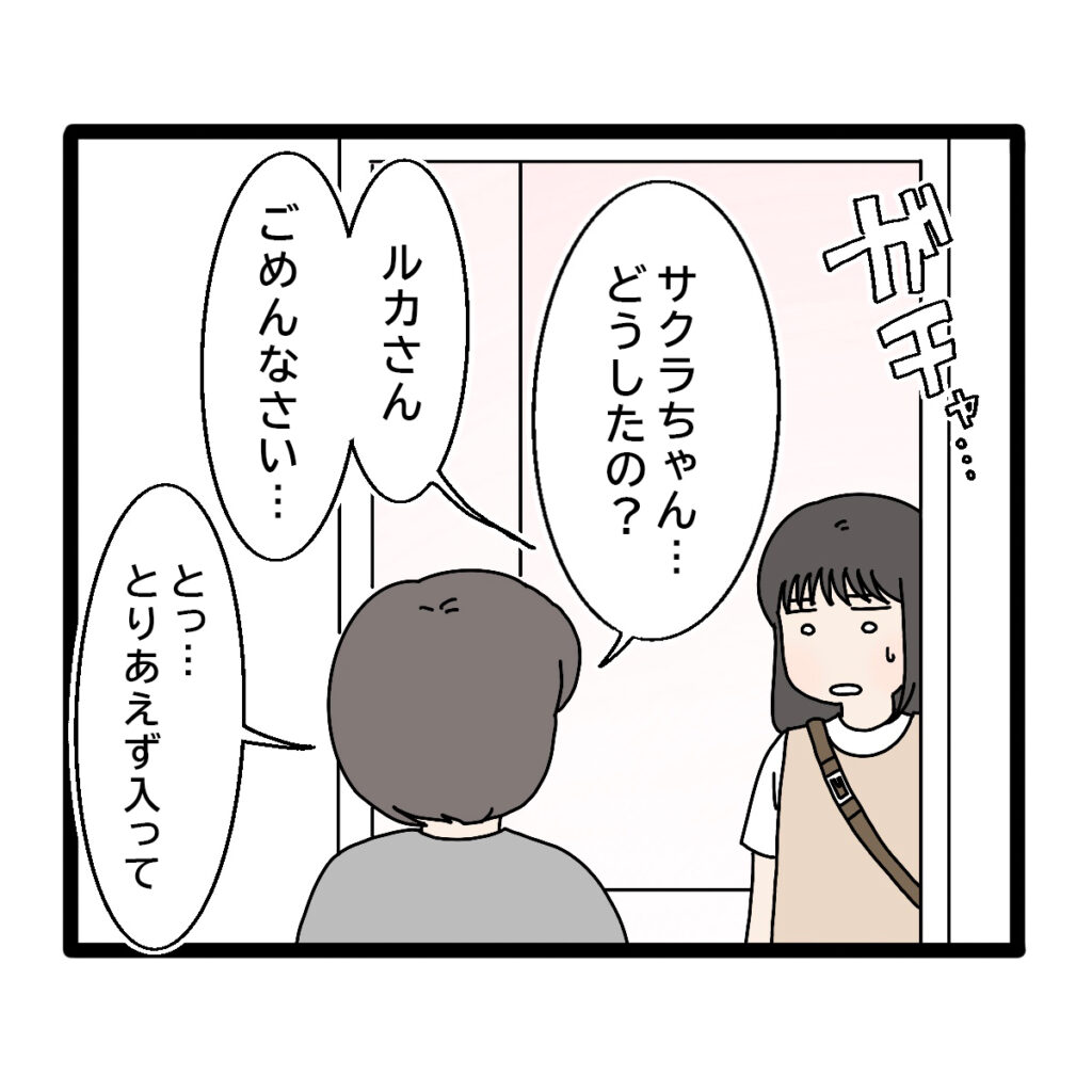 ドアを開けると、神妙な顔をしたサクラちゃんが立っていました。思いがけないお客さんに驚いていると、「ルカさん、ごめんなさい」と本当に申し訳なさそうに謝罪するサクラちゃん。「とりあえず入って」と私はすぐにサクラちゃんを家に招き入れました。